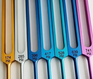Precision-tuned metal forks aligned to the ancient Solfeggio scale (e.g., 396 Hz for liberating guilt/fear, 528 Hz for DNA repair/transformation, 741 Hz for intuition/cleansing).