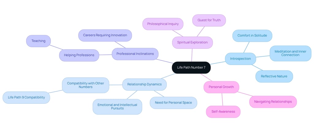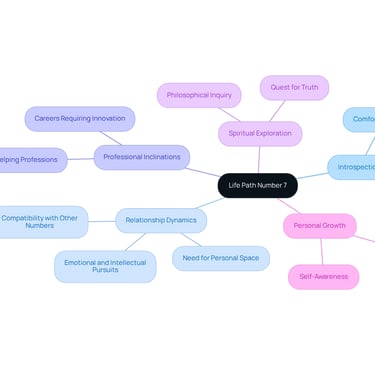 Each branch represents a key aspect of Life Path Number 7, with colors differentiating the various traits and characteristics associated with this numerological journey.