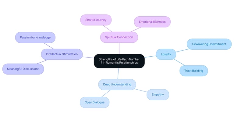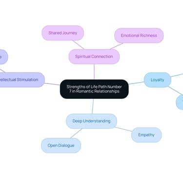 Each branch represents a strength associated with Life Path Number 7, with sub-branches explaining how these traits enhance romantic connections.